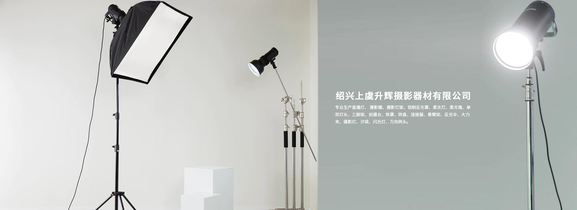 紹興上虞升輝攝影器材有限公司專業(yè)生產(chǎn)直播燈、 攝影棚、攝影燈架、鋁制反光罩、柔光燈、柔光箱、單雙燈頭、三腳架、拍攝臺(tái)、鐵罩、轉(zhuǎn)盤、連接器、懸臂架、反光傘、大力夾、攝影燈、沙袋、閃光燈、萬(wàn)向轉(zhuǎn)頭。